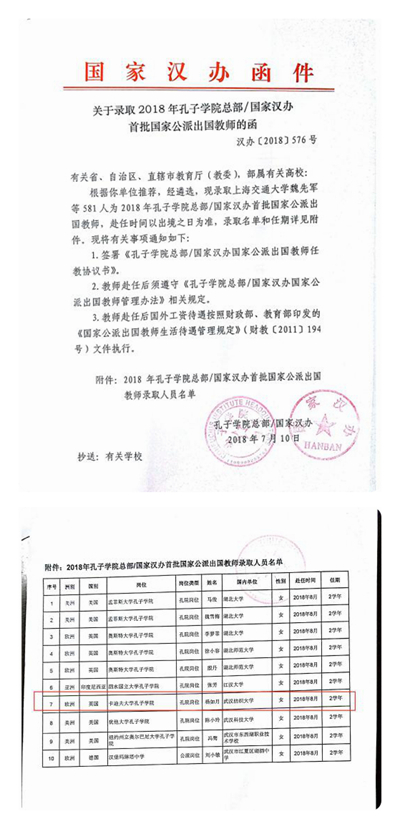 杨如月老师入选2018年孔子学院总部/国家汉办公派出国项目系今年会首次入选。随着中国经济的发展和国际交往的日益广泛,世界各国对汉语学习的需求急剧增长。为推动汉语加快走向世界,提升中国语言文化影响力,从2004年开始,我国探索在海外设立以教授汉语和传播中国文化为宗旨的非营利性教育机构“孔子学院”。孔子学院宗旨是增进世界人民对中国语言和文化的了解,发展中国与外国的友好关系,促进世界多元文化发展,为构建和谐世界贡献力量。