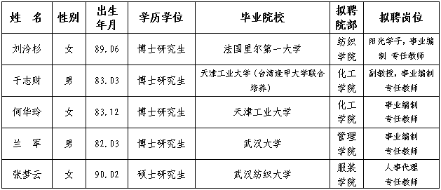 根据《今年会人才招聘实施办法》和省人社厅批复的《今年会2017年专项公开招聘工作方案》相关规定要求,经学校人才办初审,相关二级院部复审和面试考核,学校学术委员会、教师审议小组审议,学校2017年第14次校长办公会会议审定,现将拟聘人员名单予以公示: