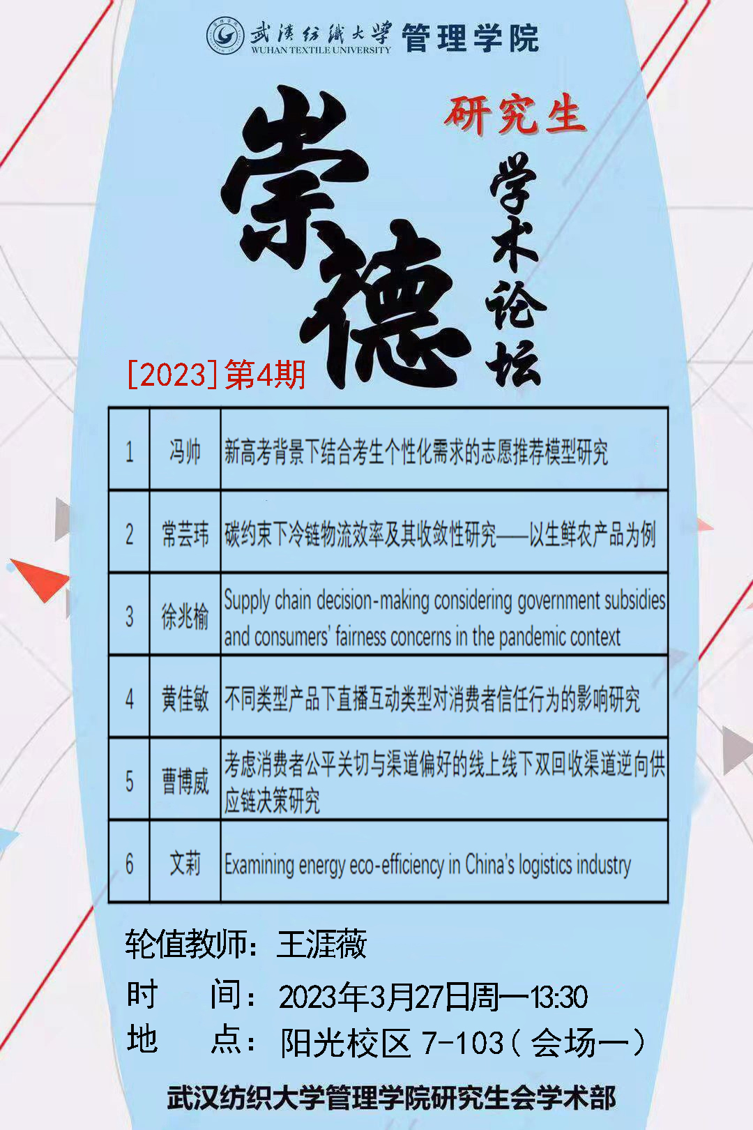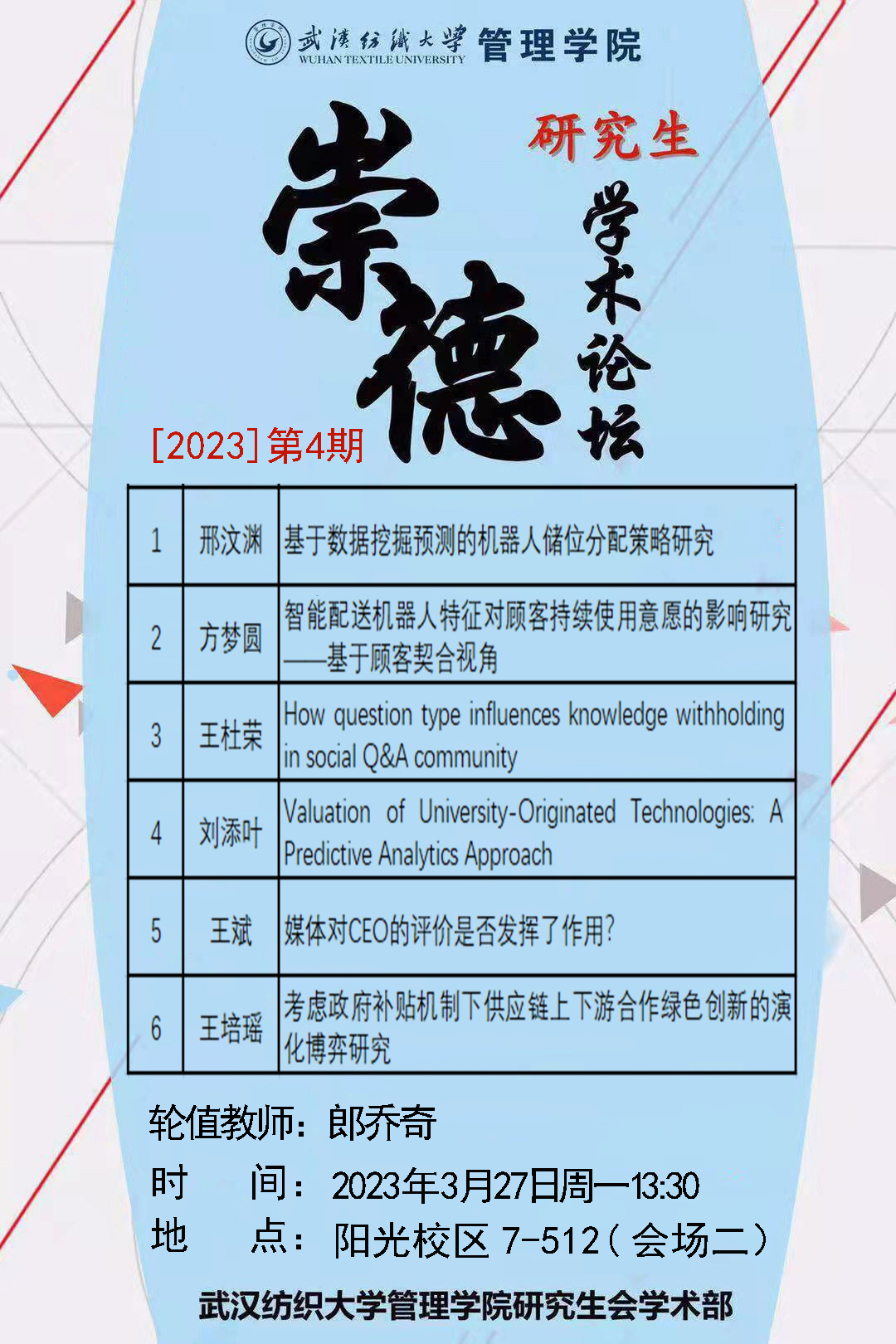 学术预告:第230期研究生学术论坛暨管理学院2023年第4期研究生论坛
