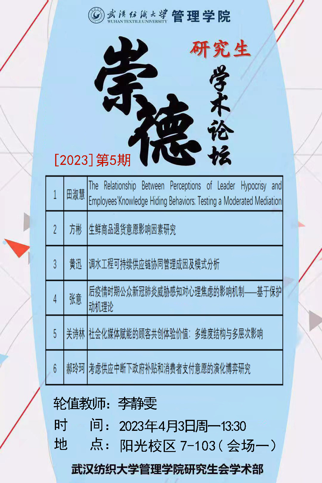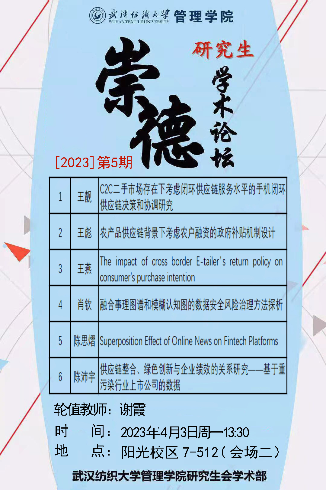 学术预告:第239期研究生学术论坛暨管理学院2023年第5期研究生学术论坛